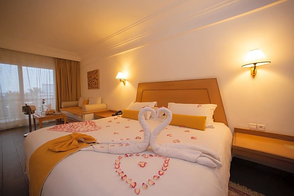 This room has a large terrace with deck chairs, overlooking the swimming pool.